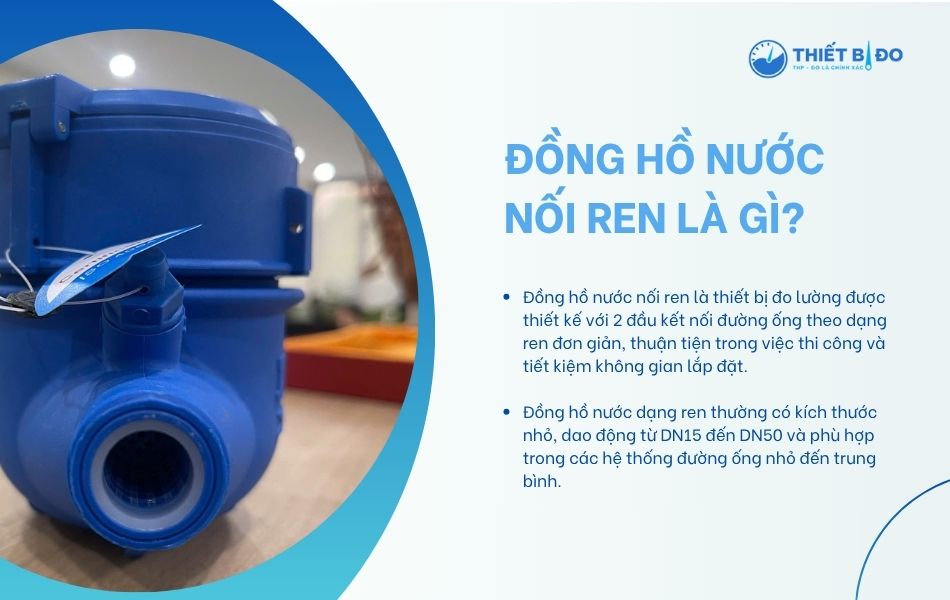 Đồng hồ nước nối ren là thiết bị đo lường được thiết kế với 2 đầu kết nối đường ống theo dạng ren đơn giản, thuận tiện trong việc thi công và tiết kiệm không gian lắp đặt. Dòng đồng hồ nước dạng ren thường có kích thước nhỏ, dao động từ DN15 đến DN50 và phù hợp trong các hệ thống đường ống nhỏ đến trung bình.