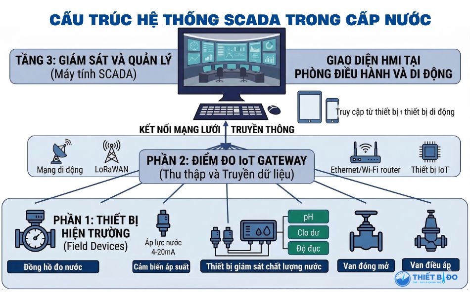 Một hệ thống SCADA trong ngành cấp nước hoàn chỉnh gồm 3 tầng cốt lõi với các chức năng vận hành riêng biệt, đóng vai trò quan trọng cụ thể như sau: